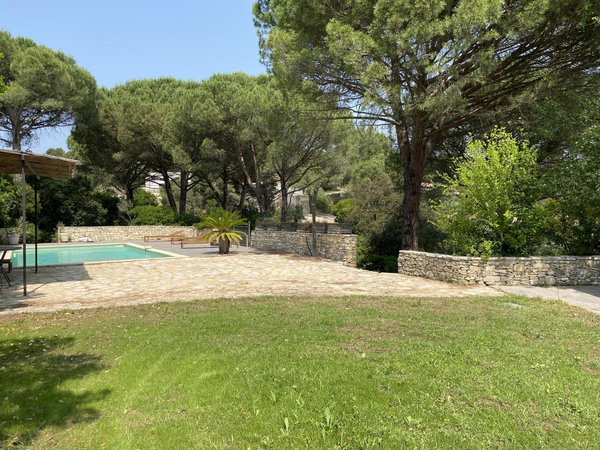 Nîmes collines route d'Uzès : Villa de 190 m² environ, composée d'un séjour de 50 m² avec poêle à bois, une cuisine semi-ouverte, 4 chambres (dont une suite avec sa salle d'eau), une salle de bains, 2 WC indépendants ainsi qu'un appartement T2 comprenant séjour avec cuisine équipée neuve, une chambre, une salle d'eau avec WC, avec entrée indépendante en rez-de-jardin et communiquant avec la maison. Le tout sur 3000 m² de terrain clos avec piscine (chauffée) 9*4.5m, terrasses, arrosage automatique, abri voiture, et pompe à chaleur avec système rafraîchissant par le sol.